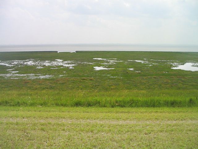 Die Betondämme mit Durchlässen, die das Deichvorland vom Watt trennen,