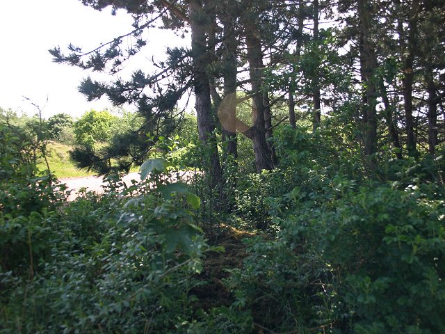 Hinter den Kiefern schimmert der rote Schotterweg durch, der von der »Straße
