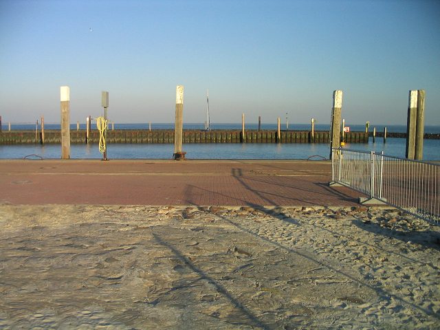 Der rot gepflasterte Westanleger mit den Inselbahnschienen befindet sich