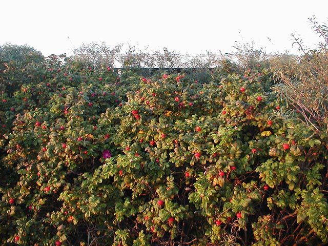 Ende September sind die Hagebutten der Kartoffelrose leuchtend rot und reif.