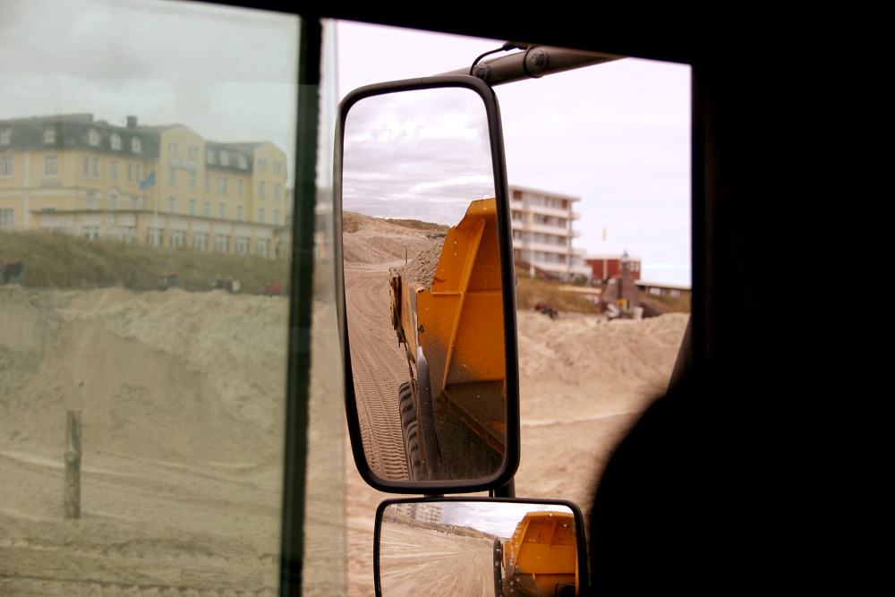 Ein flüchtiger Blick in den Rückspiegel zeigt uns die Ladefläche des Volvo-Dumpers. Links von uns ist nun schon der Hauptstrand zu sehen.
