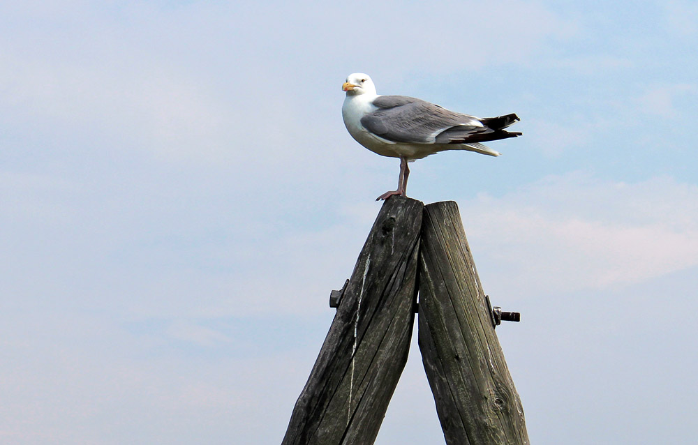 Eine Silbermöwe beobachtet von einem »A-Mast« aus die Umgebung.