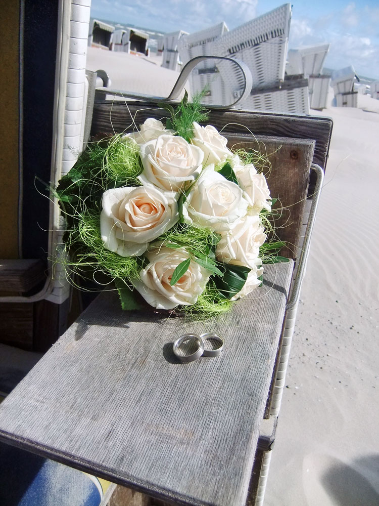 ‹ Ob hoch oben auf dem Leuchtturm oder ganz klassisch im Standesamt an der Promenade – Hochzeiten auf Wangerooge sind überaus beliebt. Nach der Trauung begeben sich die Paare gern für Erinnerungsfotos an den Strand, optimalerweise bei so schönem Wetter wie in diesem Falle.