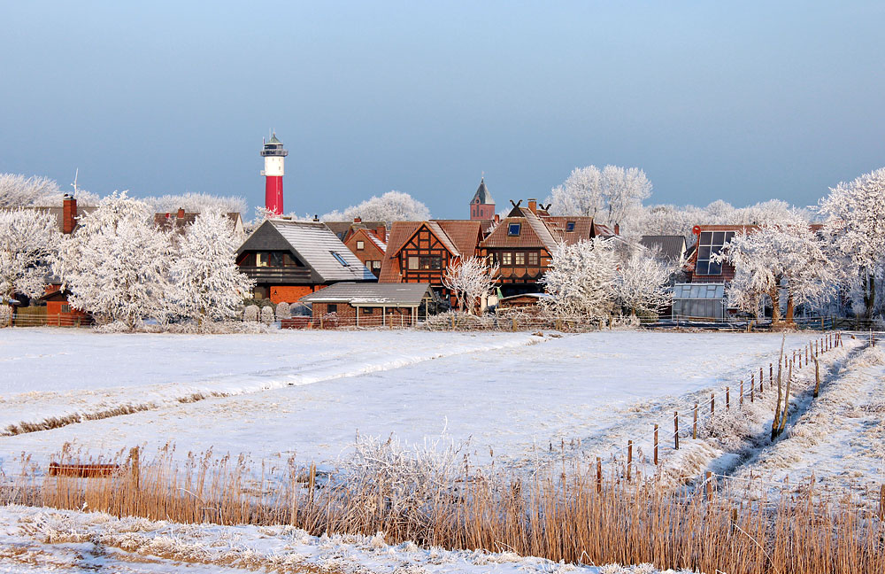 Winter auf Wangerooge – an diesem Tag präsentiert sich die Insel mit ihren verschneiten Pferdeweiden und den weiß überzuckerten Bäumen ganz besonders ausdrucksvoll.