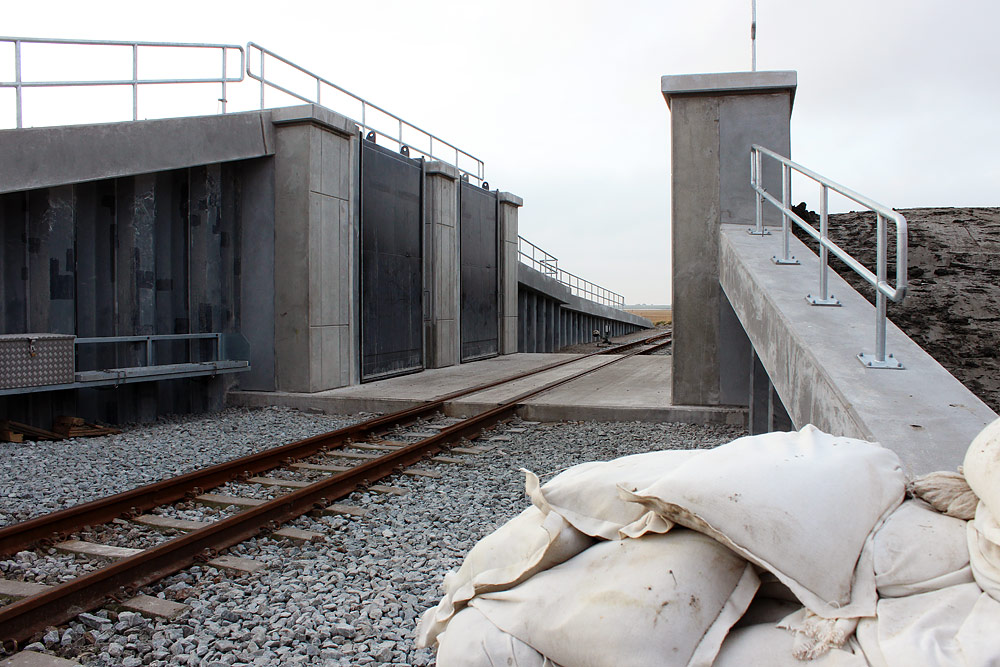 Das deutlich erhöhte Deichschart wurde erst kürzlich fertiggestellt, die Kleischicht rechts ist noch nicht mit Gras bewachsen.