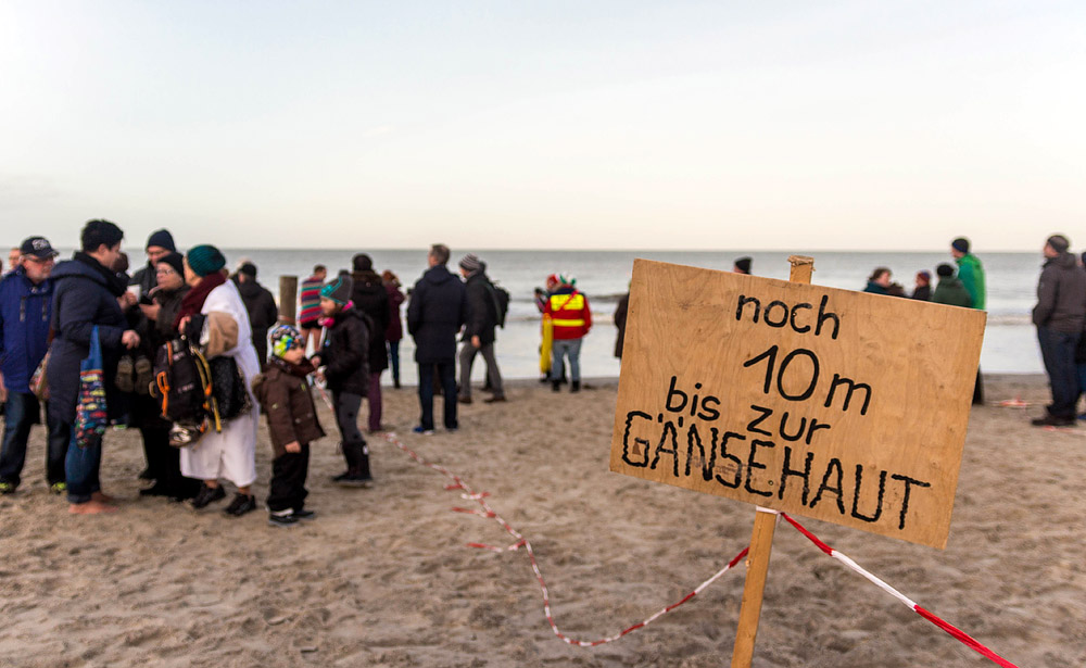 Dieses Schild mit der Aufschrift »noch 10 m bis zur Gänsehaut« richtet sich an die Badegäste und ist überaus passend, obwohl die sieben Grad Wassertemperatur verglichen mit anderen Jahren vergleichsweise tropisch ist.