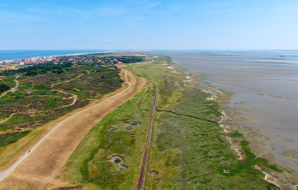 Das Deichvorland des Süddeiches wird, vor allem im hinteren Bereich, auch als Süderheller bezeichnet. Mehr oder weniger parallel zum Deich führt die Bahnstrecke, die wir unten sehen, geradewegs in Richtung Inseldorf.