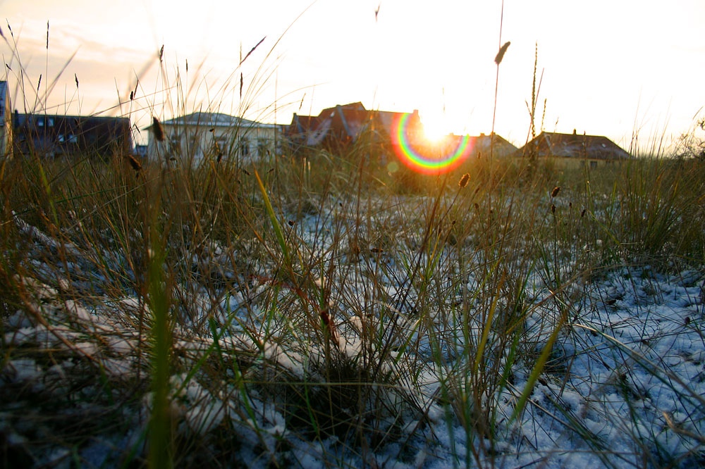 Wie Watte liegen die kürzlich gefallenen Schneeflocken zwischen den langen Grashalmen auf der Polizeiwiese.