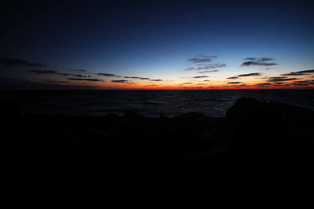 Ein schöner Tag neigt sich seinem Ende zu, während wir hier zur Abenddämmerung am Südwestdeckwerk sitzen und aufs Meer blicken.