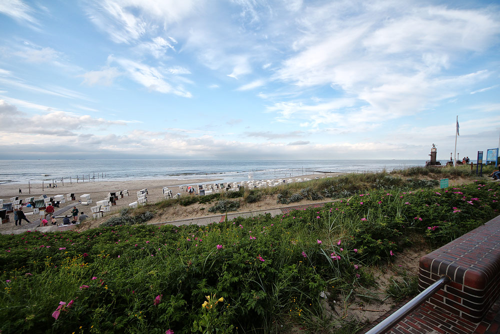 Hier ein Blick von der Strandpromenade nördlich vom Haus Monopol auf den Hauptstrand mit Strandkorb-Westfeld.