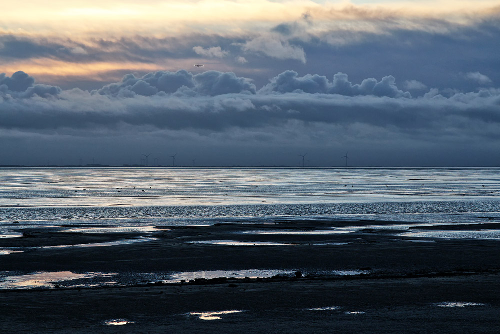 Während die Bildautorin hier bei Niedrigwasser aufs Wattenmeer schaut, nähert sich in der Ferne eine Britten-Norman BN-2 Islander der Inselflieger FLN. Gleich wird die Linienmaschine zum Endanflug in Richtung Landebahn einbiegen.