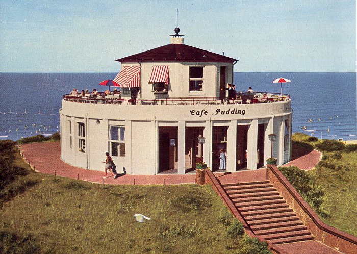 Bevor das »Café Pudding« ausgebaut wurde, besaß es eine Terrasse auf seinem Dach, auf der man gemütlich bei Kaffee und Kuchen sitzen und das Treiben am Strand beobachten konnte.
