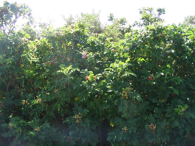 die Kartoffelrosen schon so hoch gewachsen, daß sie uns überragen.