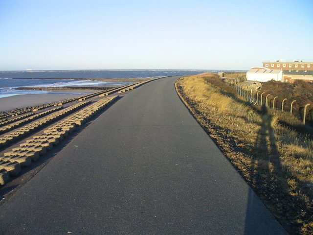 Links fangen nun wieder die Betonstein-Wellenbrecher-Reihen an.