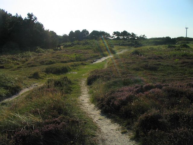 Beide Wege vereinigen sich wieder; im Hintergrund rechts sehen Sie das Windrad,