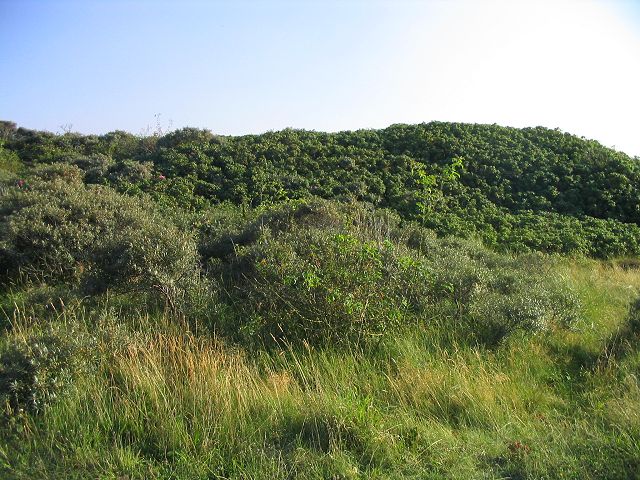 Ein Hügel, der eigentlich ein von Sand und Heckenrosen bedeckter Bunker ist.