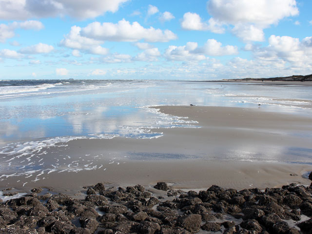 Die herbstlichen Wolken spiegeln sich im nassen Sand.
