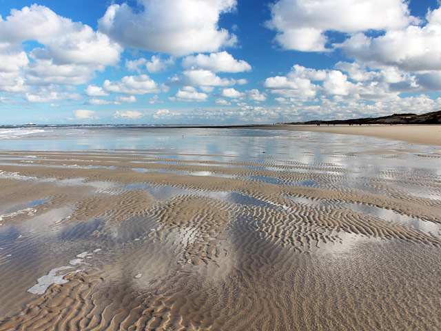 Der Strand ist an dieser Stelle von kleinen Prielen und Löchern durchzogen.